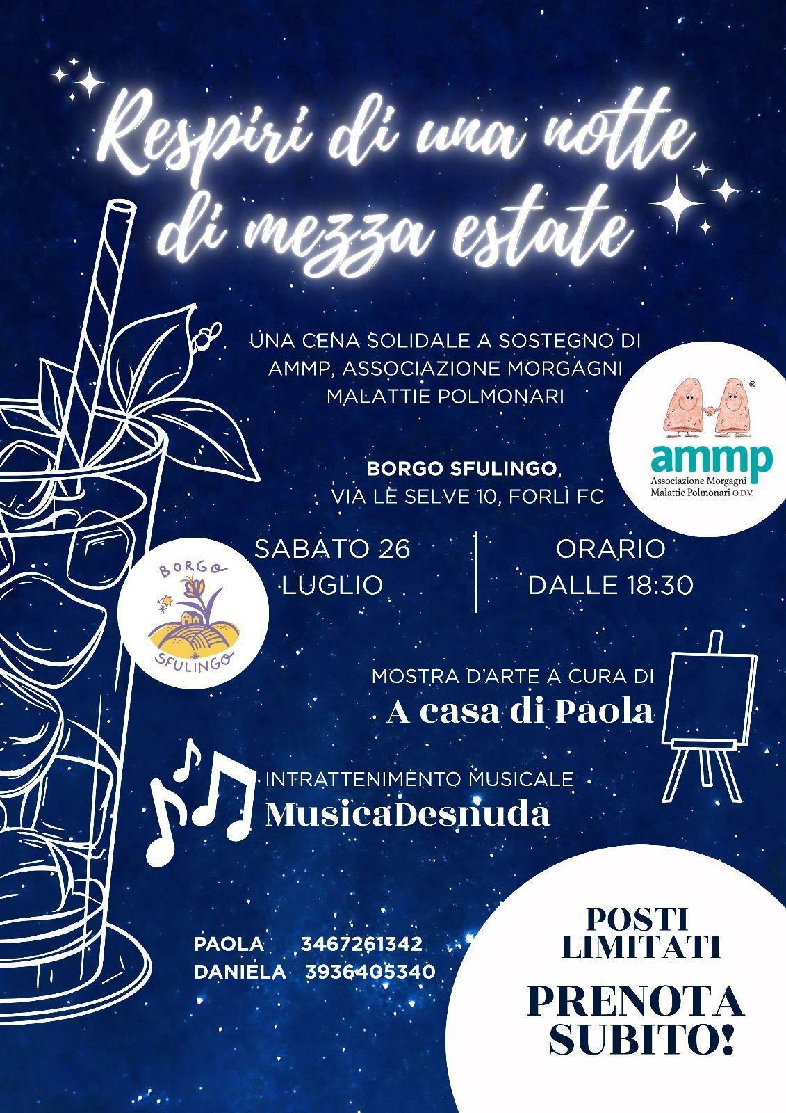 Sabato 26 luglio, nonostante la pioggia battente, si è svolta con coraggio e straordinaria partecipazione la cena solidale “Respiri di una notte di mezza estate”, organizzata a sostegno di AMMP – Associazione Morgagni Malattie Polmonari, presso lo spazio suggestivo di Borgo Sfulingo, tra Forlì e Meldola.