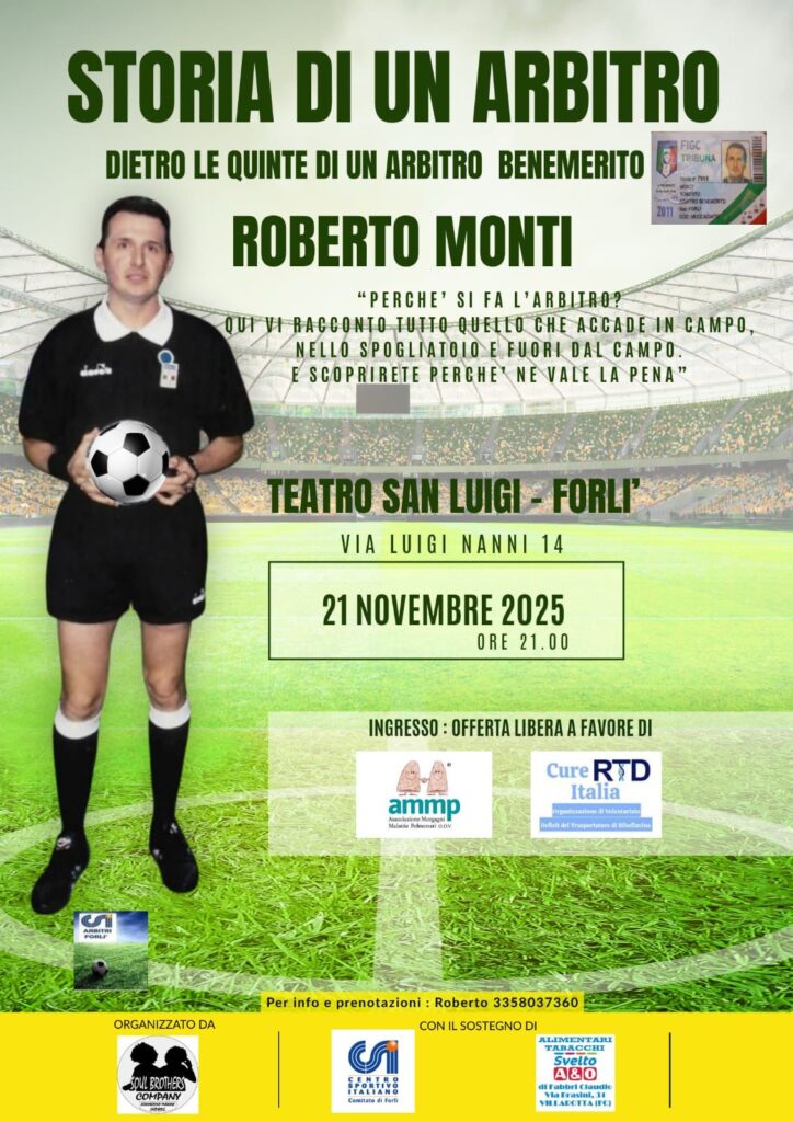 In questa serata speciale, Roberto Monti, arbitro benemerito, accompagnerà il pubblico in un viaggio fatto di aneddoti, emozioni e racconti autentici vissuti in campo, negli spogliatoi e fuori dal rettangolo di gioco.
